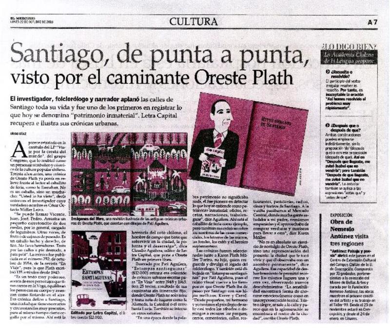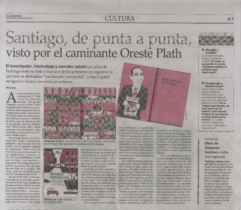 Santiago, de punta a punta, visto por el caminante Oreste Plath [artículo] Iñigo Díaz.