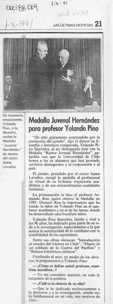 Medalla Juvenal Hernández para profesor Yolando Pino [artículo].