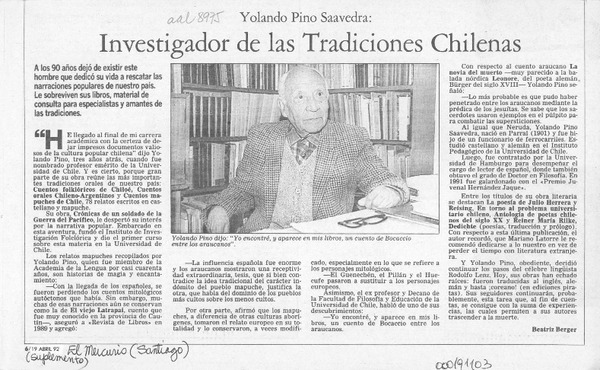 Investigador de las tradiciones chilenas [artículo] Beatriz Berger.