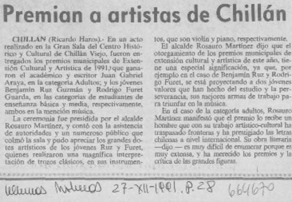 Premian a artistas de Chillán [artículo] Ricardo Haros.