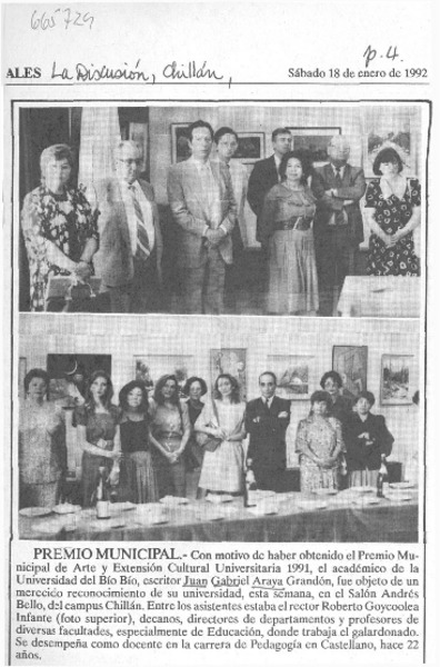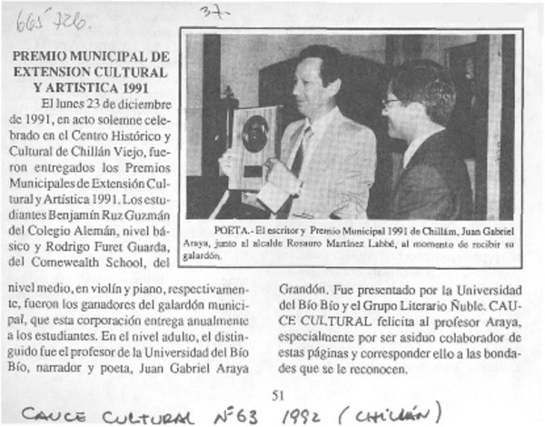 Premio municipal de extensión cultural y artística 1991. [artículo]