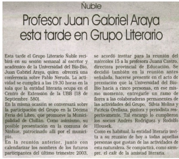 Recital de Juan Gabriel Araya en el Grupo Literario Ñuble. [artículo]