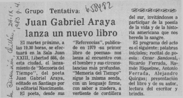 Juan Gabriel Araya lanza un nuevo libro. [artículo]