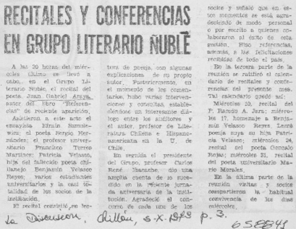 Recitales y conferencias en Grupo Literario Ñuble. [artículo]