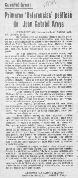 Primeras "Referencias" poéticas de Juan Gabriel Araya [artículo] Alfonso Larrahona Kästen.