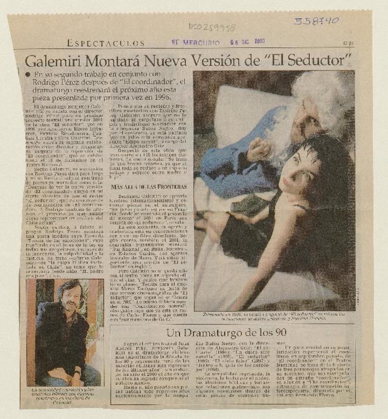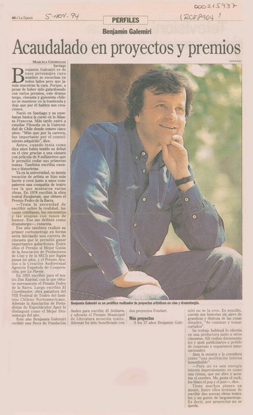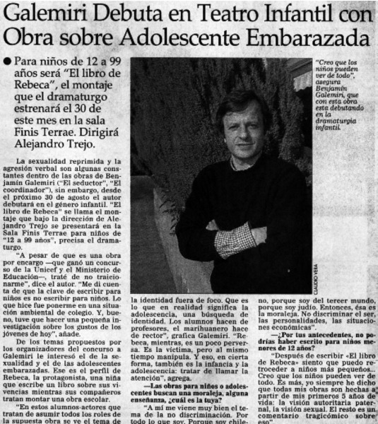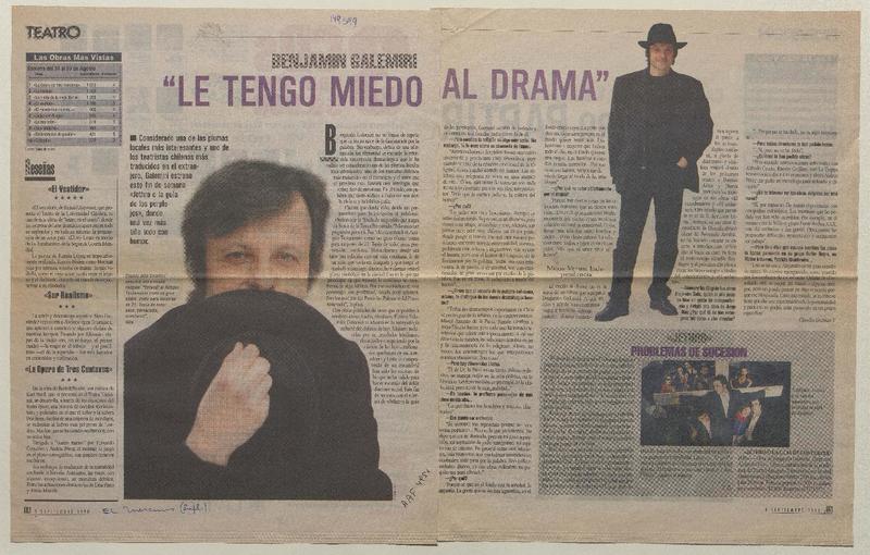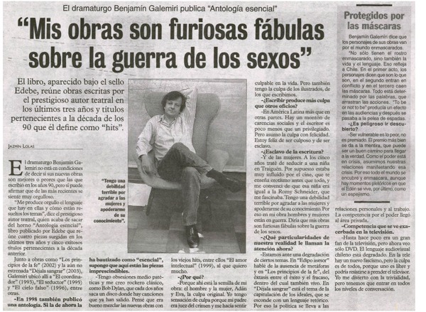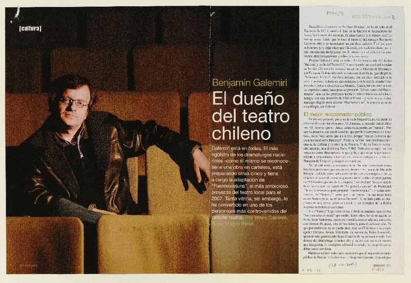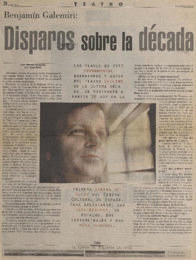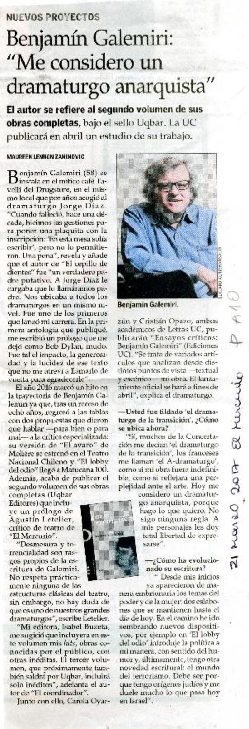 Benjamín Galemiri "Me considero dramaturgo un anarquista" [entrevista] [artículo] : Maureen Lennon Zaninovic.