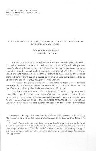 Autores chilenos - Entrevistas - Parra, Marco Antonio de la - Radrigán, Juan - Galemiri, Benjamín - Stranger, Inés Margarita - Griffero S., Ramón - Autores franceses - Didym, Michel