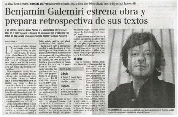 Benjamín Galemiri estrena obra y prepara retrospectiva de sus textos [artículo] Rodrigo Miranda.