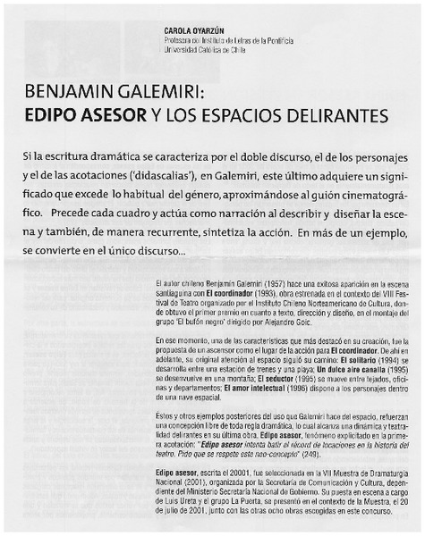 Benjamín Galemiri: Edipo Asesor y los espacios delirantes [artículo] Carola Oyarzún.