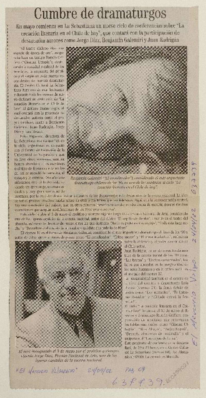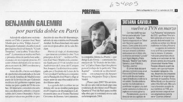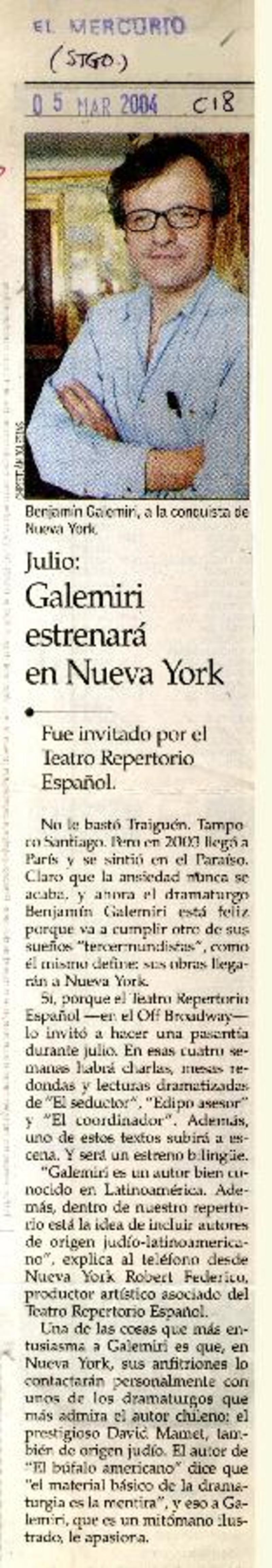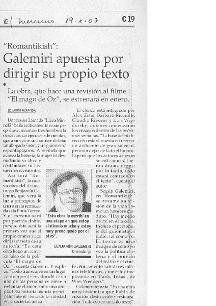Tres obras de Benjamìn Galemiri se darán este mes [artículo] Leopoldo Pulgar I.