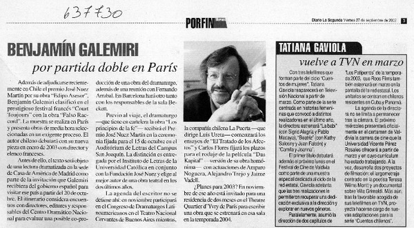 Tamara Acosta estrenará en Madrid la última obra de Benjamín Galemiri [artículo] Andrea González y Verónica Marinao.
