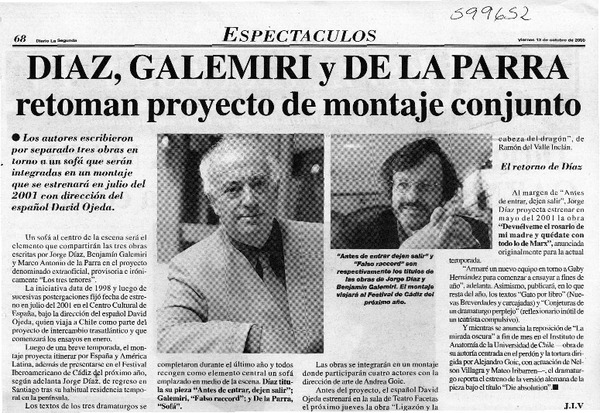 Díaz, Galemiri y De la Parra retoman proyecto de montaje conjunto [artículo] J. I. V.