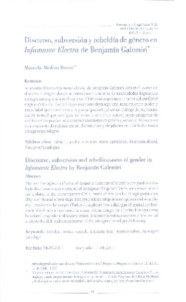 Discurso, subversión y rebeldía de género en Infamante Electra de Benjamín Galemiri [artículo] Marcela Medina Bravo.