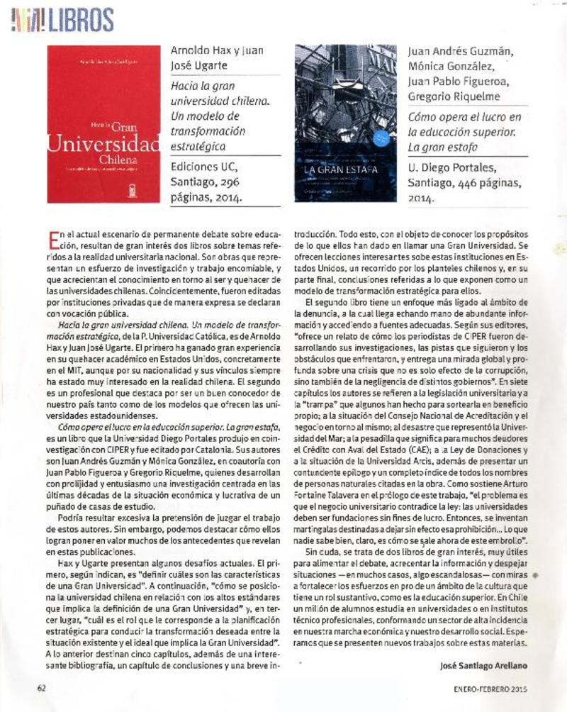 Autores chilenos - González, Mónica - Guzmán, Juan Andrés - Hax C., Arnoldo - Hacia la gran universidad chilena. Un modelo de transformación estratégica - Ugarte, Juan José - La gran estafa - Figueroa, Juan Pablo - Riquelme, Gregorio
