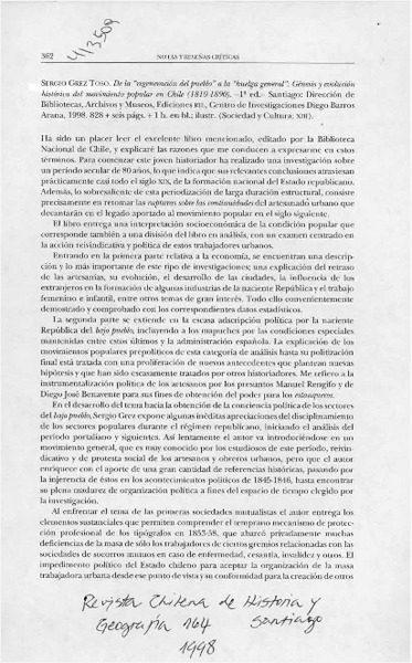 De la "regeneración del pueblo" a la huelga general. Génesis y evolución histórica del movimiento popular en Chile (1810-1890) [artículo] Jorge Rojas Flores.