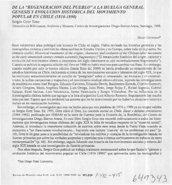 De la "regeneración del pueblo" a la huelga general, Génesis y evolución histórica del movimiento popular en Chile (1810-1890) [artículo] Brian Loveman