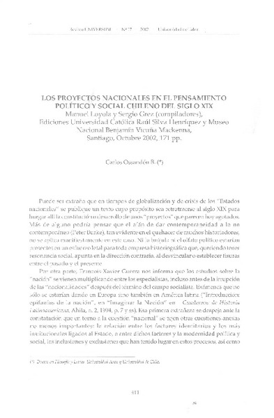 Los proyectos nacionales en el pensamiento político y social chileno del siglo XIX [artículo] Carlos Ossandón B.