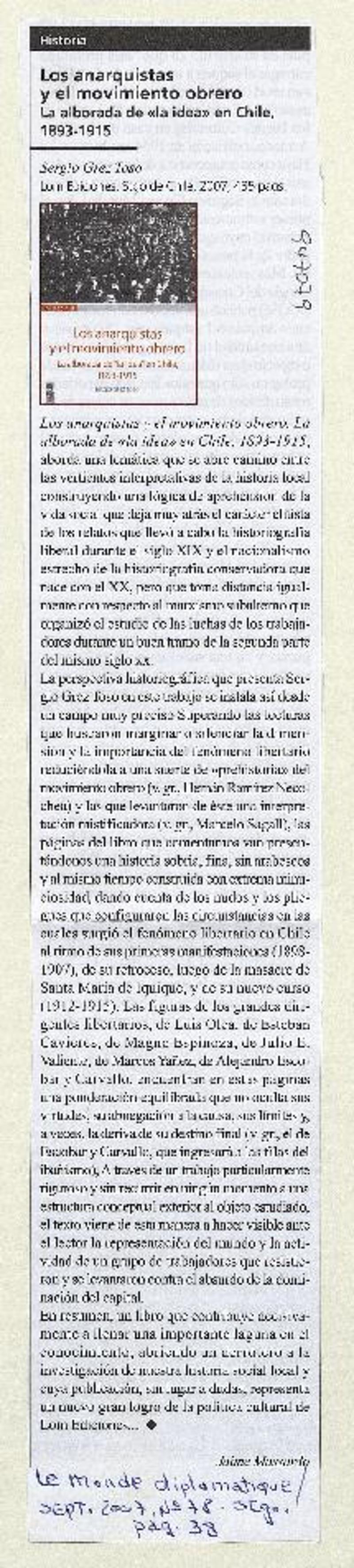 Autores chilenos - Grez Toso, Sergio - Los anarquistas y el movimiento obrero
