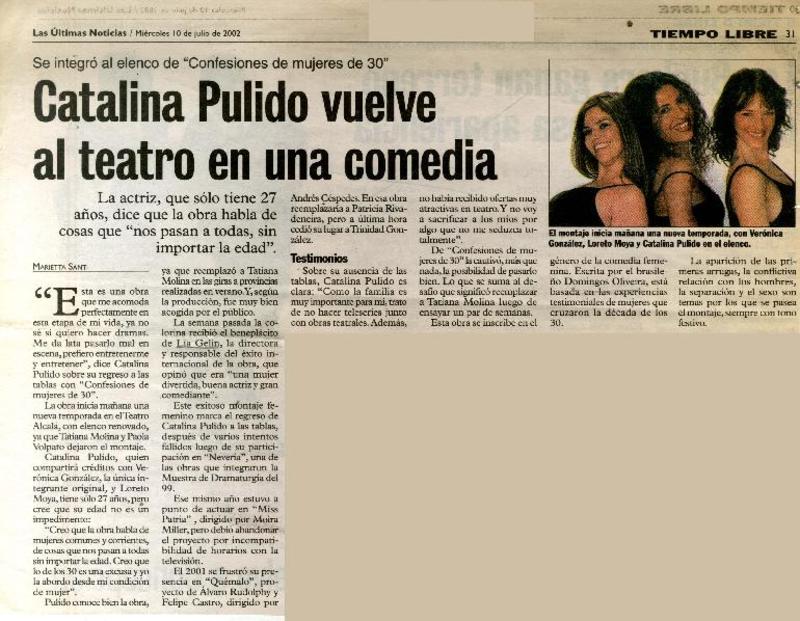 Catalina Pulido vuelve al teatro en una comedia [artículo] Marietta Santi.