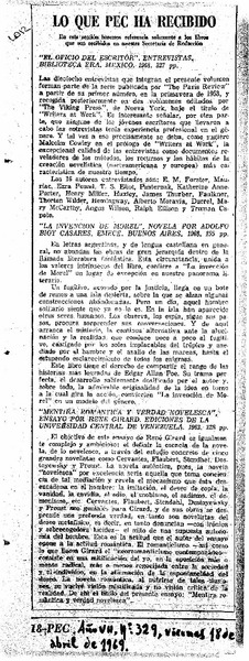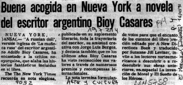 Buena acogida en Nueva York a novela del escritor argentino Bioy Casares [artículo]