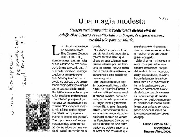Autores argentinos - Bioy Casares, Adolfo - Magia modesta, Una