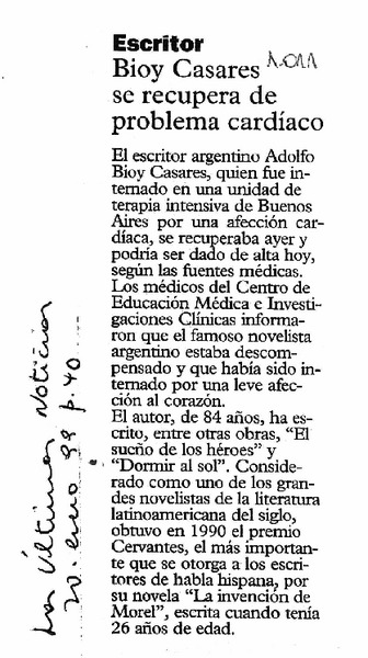 Escritor Bioy Casares se recupera de problema cardíaco. [artículo]