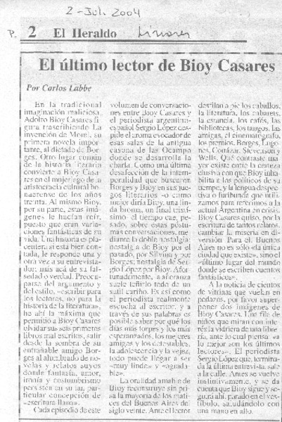 El Ultimo lector de Bioy Casares [artículo]Carlos Labbé Márquez