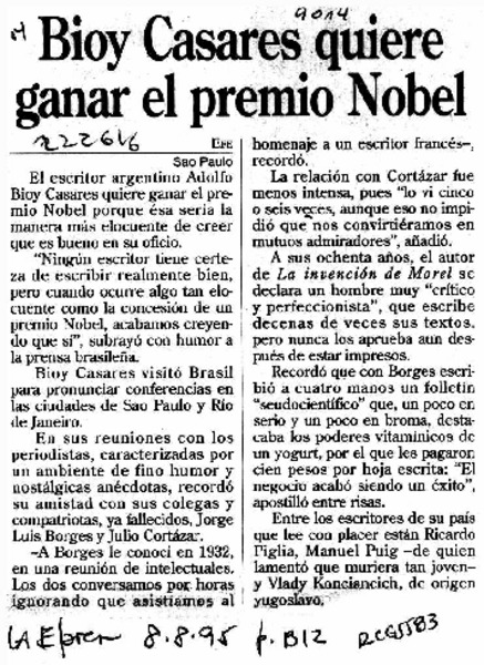 Bioy Casares quiere ganar el premio Nobel [artículo].