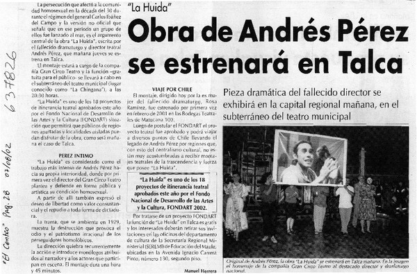 Obra de Andrés Pérez se estrenará en Talca [artículo] Manuel Herrera