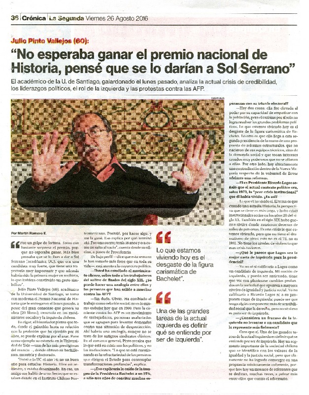 Julio Pinto Vallejos(60): "no esperaba ganar el premio nacional de Historia, pensé que se lo darían a Sol serrano" [artículo] : Martín Romero.