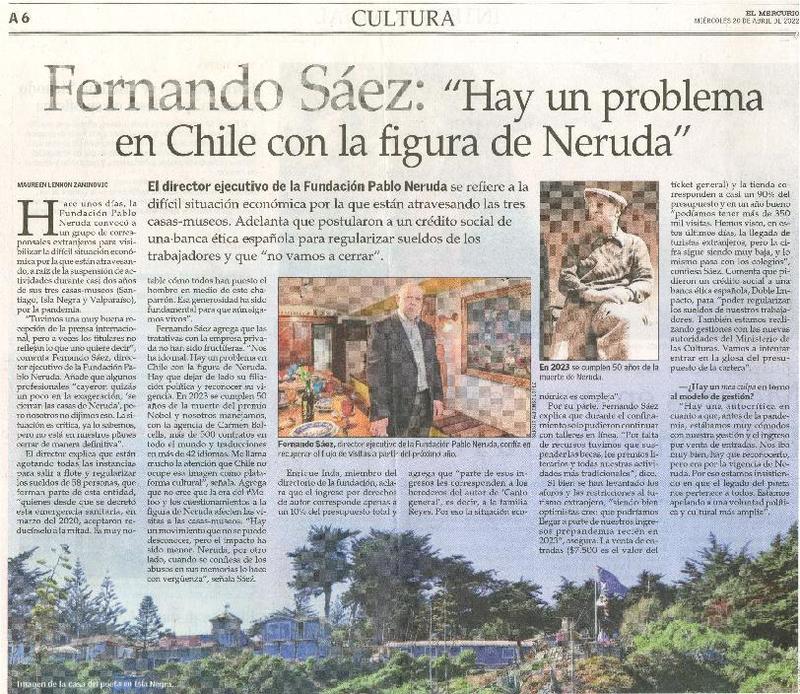 Fernando Sáez, "Hay un problema en Chile con la figura de Neruda". [artículo] Maureen Lennon Zaninovic.