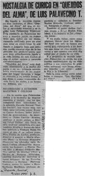 Nostalgia de Curicó en "Quejidos del alma", de Luis Palavecino T. [artículo] H. A. R.