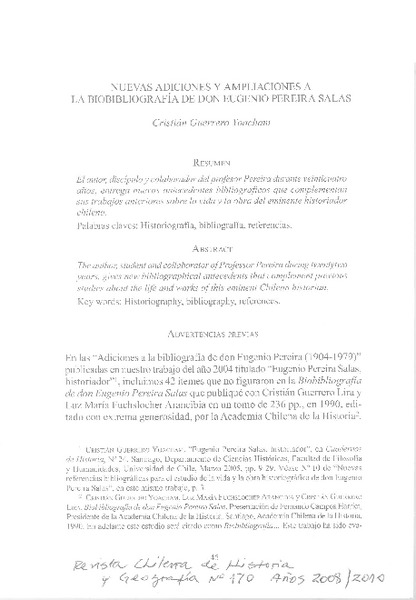 Nuevas adiciones y ampliaciones a la bibliografía de don Eugenio Perira Salas [artículo] Cristián Guerrero Yoacham.