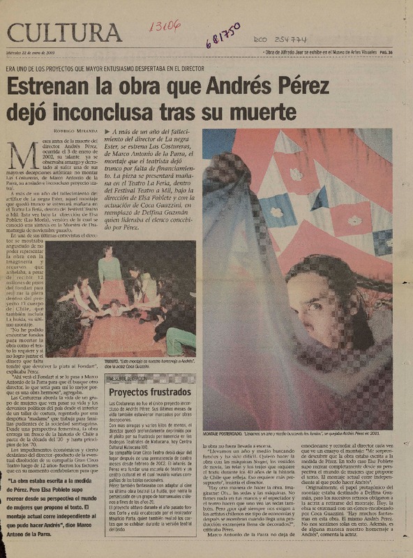 Estrenan la obra que Andrés Pérez dejó inconclusa tras su muerte [artículo] Rodrigo Miranda.