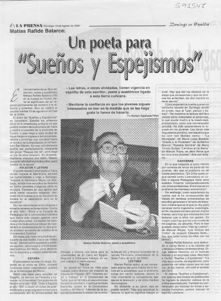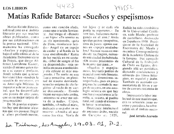 Matías Rafide Batarce : "Sueños y espejismos" [artículo] José Arraño Acevedo.