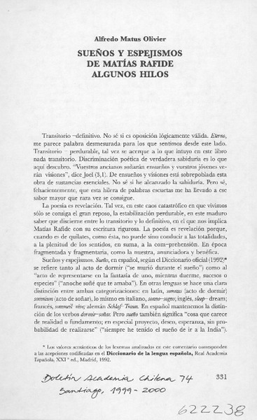Sueños y espejismos de Matías Rafide algunos hilos [artículo] Alfredo Matus Olivier
