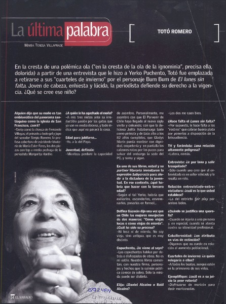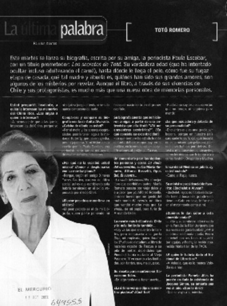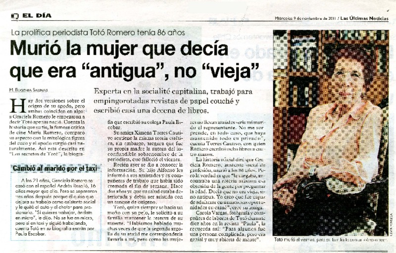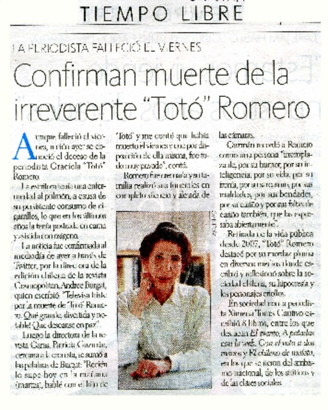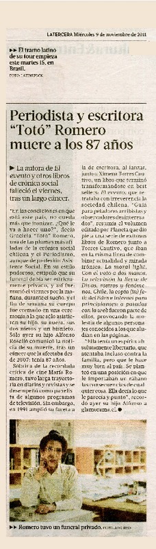 Periodista y escritora "Totó" Romero muere a los 87 años [artículo].