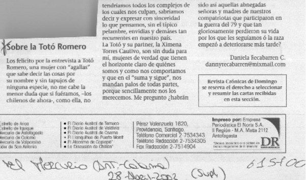 Sobre la Totó Romero [artículo] Daniela Recabarren C.