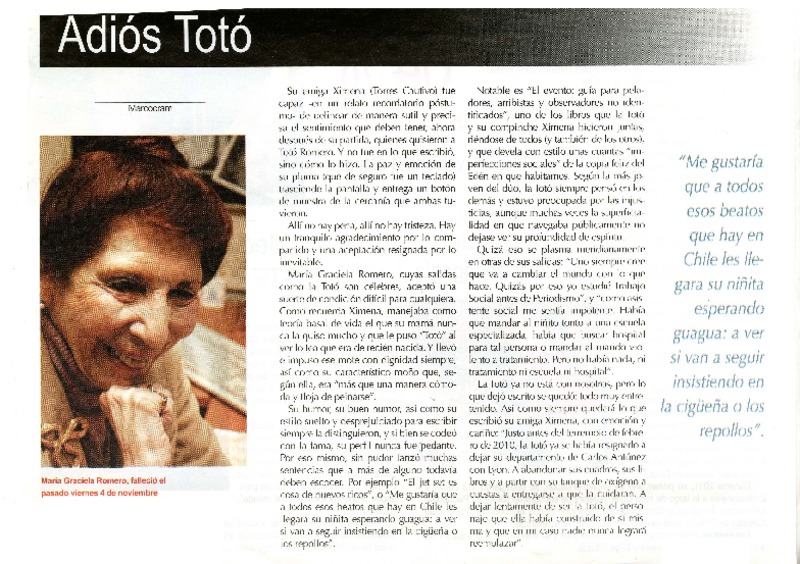 Murió Graciela "Totó" romero, aguda observadora social [artículo] Pablo Reed.