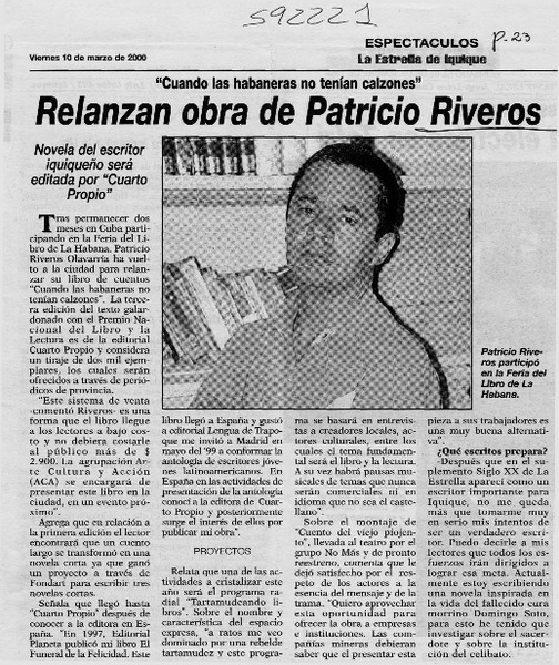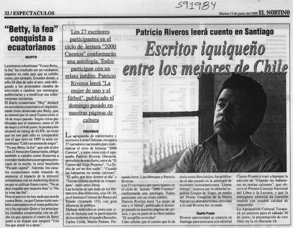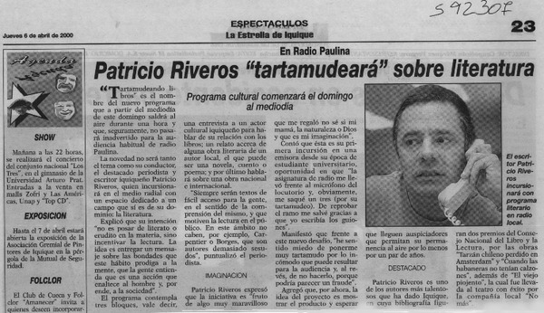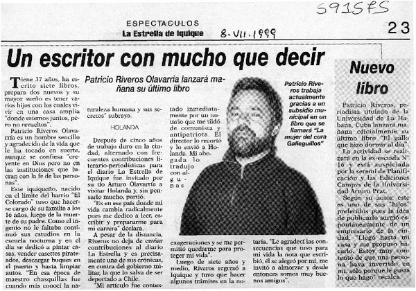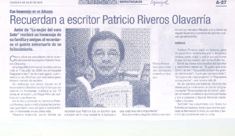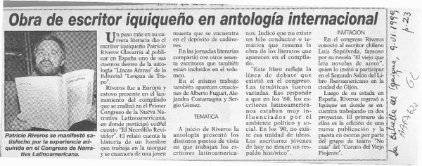 A España viaja el escritor iquiqueño Patricio Riveros [artículo] Simoy Gahona Lay.