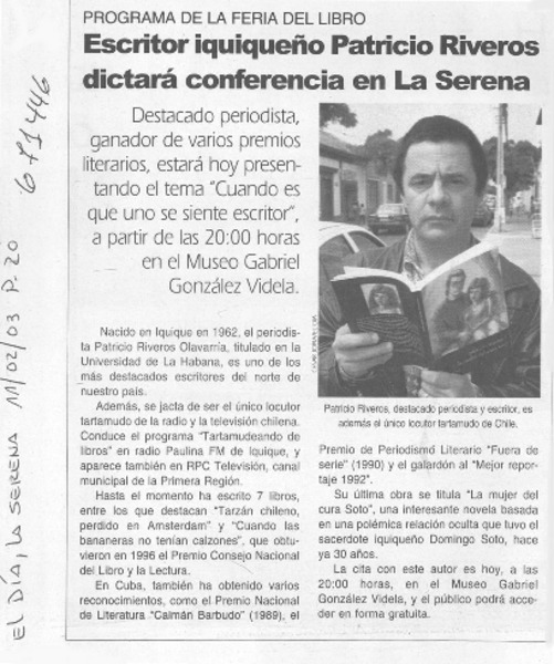 Escritor iquiqueño Patricio Riveros dictará conferencia en La Serena. [artículo]