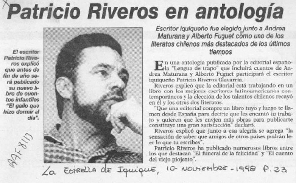 Patricio Riveros aparecerá en antología internacional [artículo] Mario Córdova Fré.