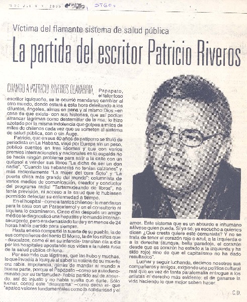 Víctima del flamante sistema de salud pública : la partida del escritor Patricio Riveros [artículo]