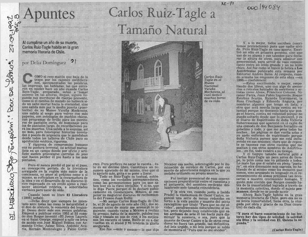 Carlos Ruiz-Tagle a tamaño natural [artículo] Delia Domínguez.