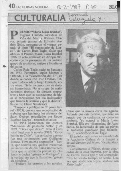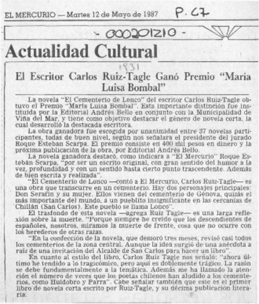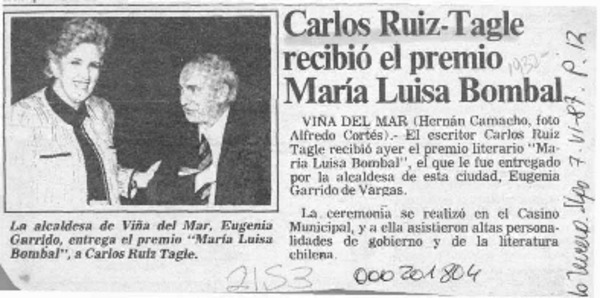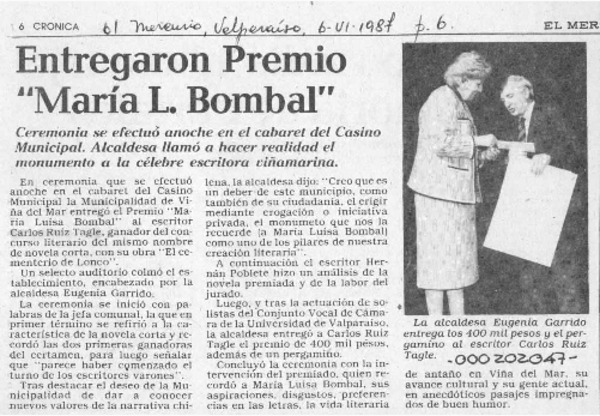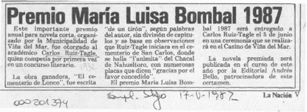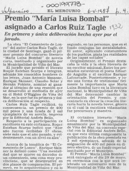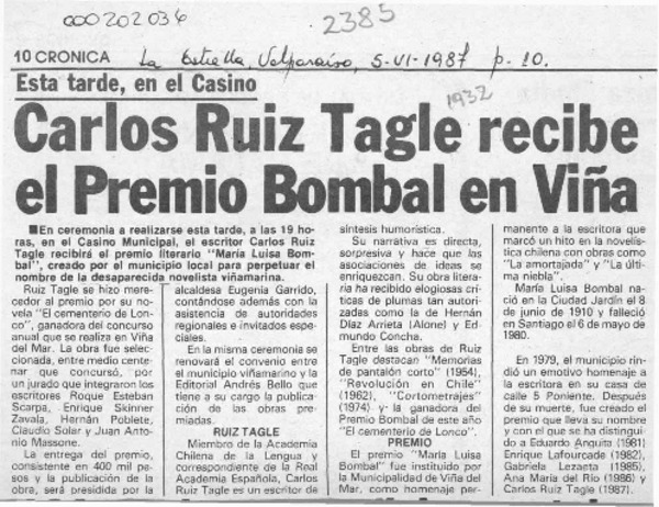 Carlos Ruiz Tagle ganó premio "María Luisa Bombal 1987" [artículo].