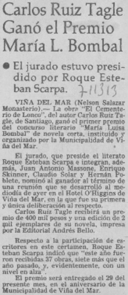 Carlos Ruiz Tagle ganó el premio María L. Bombal [artículo] Nelson Salazar Monasterio.