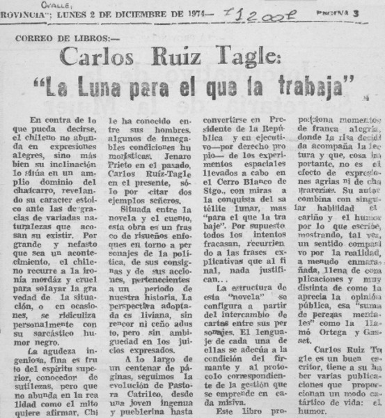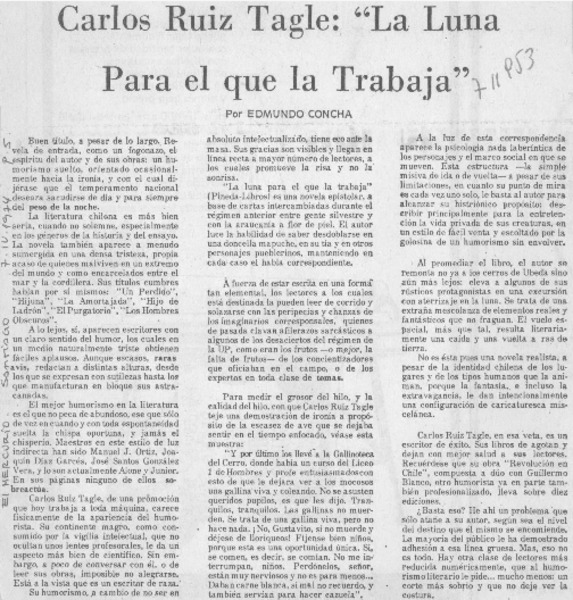 Carlos Ruiz Tagle: "La luna para el que la trabaja" [artículo] Edmundo Concha.