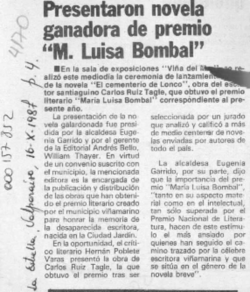 Presentaron novela ganadora de premio "M. Luisa Bombal" [artículo].