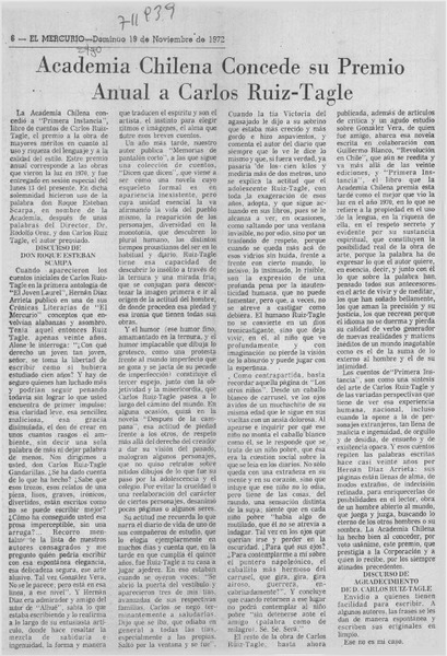 Academia chilena concede su Premio anual a Carlos Ruiz-Tagle. [artículo]