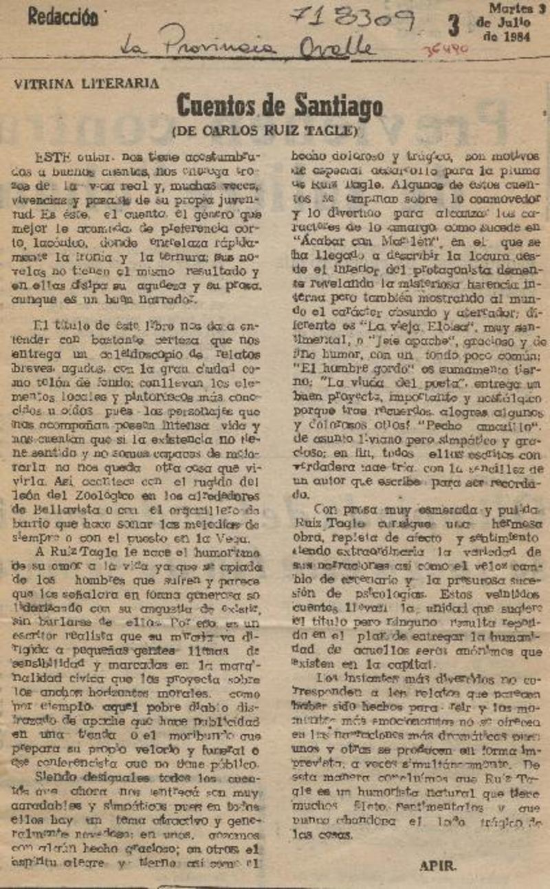 Autores chilenos - Ruiz-Tagle, Carlos - Cuentos de Santiago - La Prensa (Curicó, Chile)--